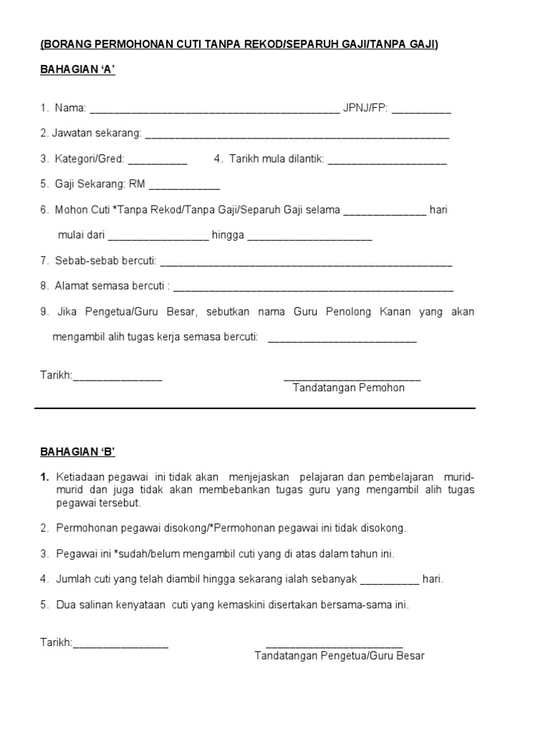 Permohonan cuti tanpa gaji dan separuh gaji kakitangan tetap. Cara mohon bantuan kewangan rm600 untuk pekerja yang terpaksa mengambil cuti tanpa gaji. Manakala borang permohonan bantuan rm100 ini boleh di download melalui pautan yang disertakan di laman rasmi nadma (agensi pengurusan baca juga: 3 cuti tanpa gaji menjaga anak (selepas cuti bersalin). Borang permohonan cuti tanpa gaji urusan peribadi.doc.